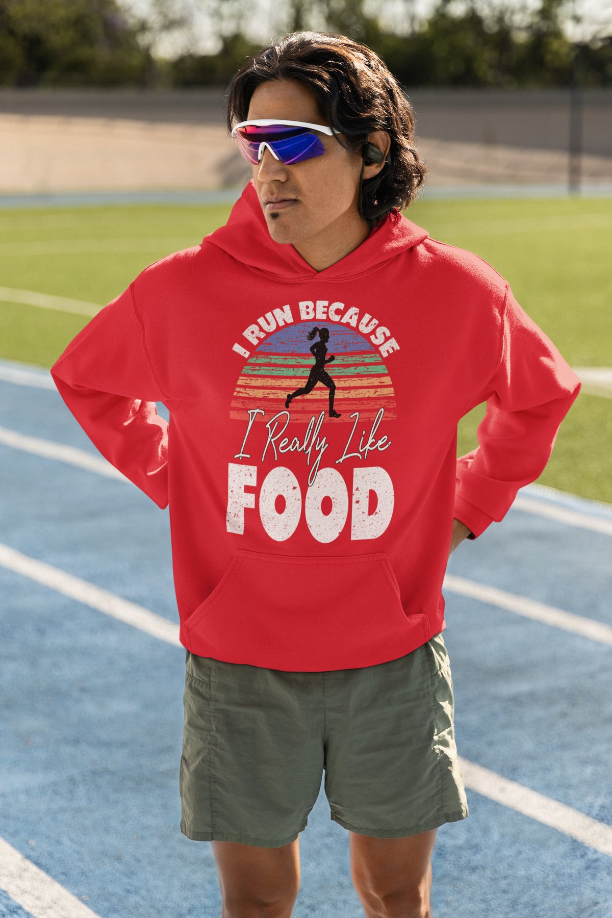 I run because I really like food — the most honest running motivation ever. This retro sunset design with a female runner silhouette celebrates the runners who earn every single calorie.