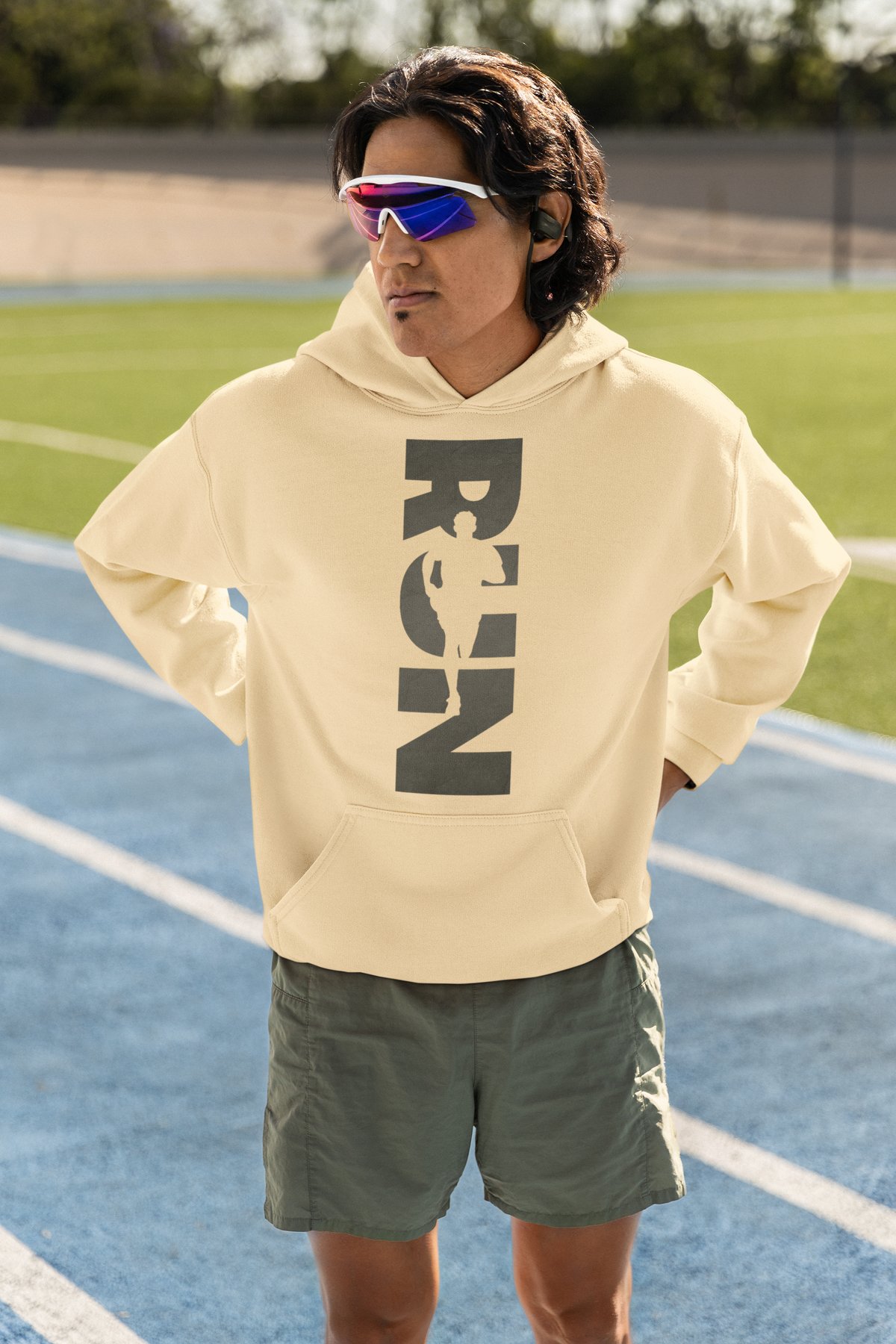 RUN — displayed in bold vertical typography with a runner silhouette integrated into the letters. This sleek, modern design is understated yet powerful. A runner’s wardrobe essential.