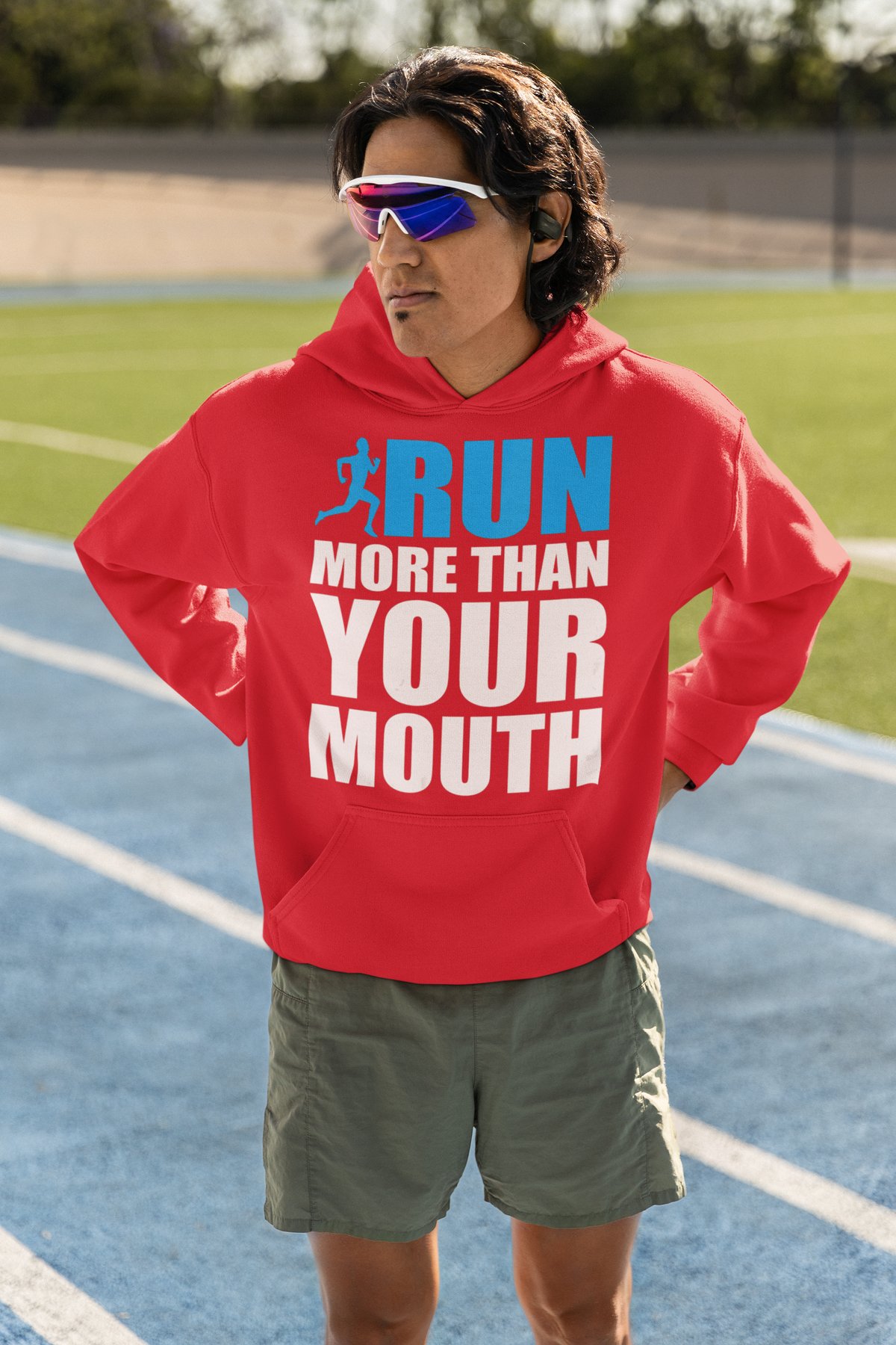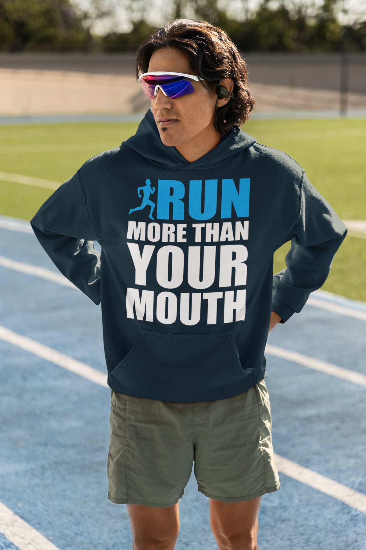 Run more than your mouth — actions speak louder than words, and miles speak louder than both. This bold blue typography with a runner silhouette is for runners who back up their talk with action.